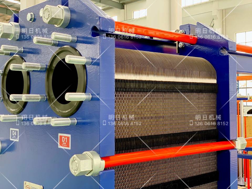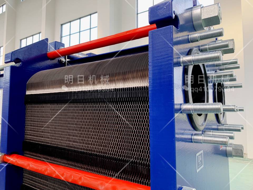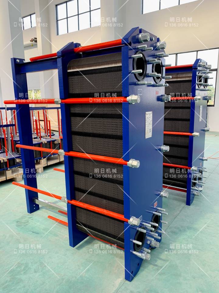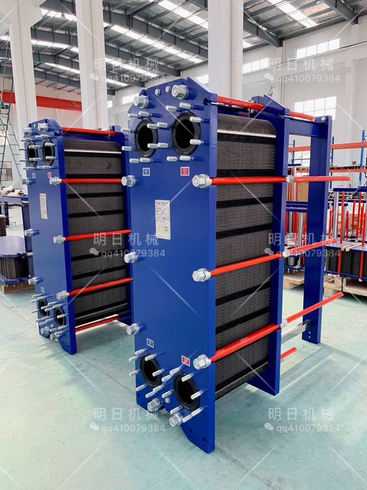 板式換熱器是由一組波紋金屬板組成,板上有四個角孔,供傳熱的兩種液體通過。金屬板片安裝在一個側面有固定板和活動壓緊板的框架內,并用夾緊螺栓夾緊。板片上裝有密封墊片,將流體通道密封,并且引導流體交替地流至各自的通道內,形成熱交換。流體的流量、物理性質、壓力降和溫度差決定了板片的數量和尺寸。波紋板不僅提高了湍流程度,并且形成許多支撐點,足以承受介質間的壓力差。金屬板和活動壓緊板懸掛在上導桿,并由下導桿定位,而桿端則固定在支撐柱上,由于具備高性能、省空間、省能源、維護簡單等許多優點,板式換熱器已獲得各行業的高度肯定。產品廣泛應用于冶金、食品、輕工、化工、制冷和暖通等領域。